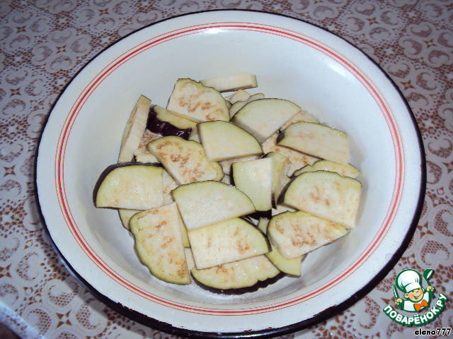 Баклажаны порезать кружочками, если крупные, то полукольцами. Посыпать солью и дать постоять, пока мы будем готовить мясо.