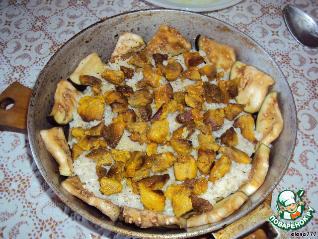 Баклажаны промыть холодной водой, отжать. Сковороду самазать растительным маслом и хорошо нагреть на плите. Выложить на дно и бока кружочки баклажанов.
