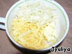 Сыр и яблоко потереть на крупной терке, добавить размягченное масло, все перемешать. -