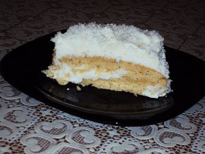 Крем размазать - верх и бока. Посыпать кокосовой стружкой. И поставить в холодильник на 1 час.