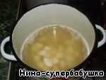 В горячий бульон, налитый в кастрюлю, положить картофель и довести до кипения.