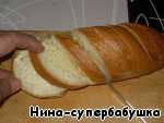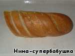 В это время приготовить чесночные гренки. Багет разрезать наискосок на тонкие ломтики, не дорезая до конца.