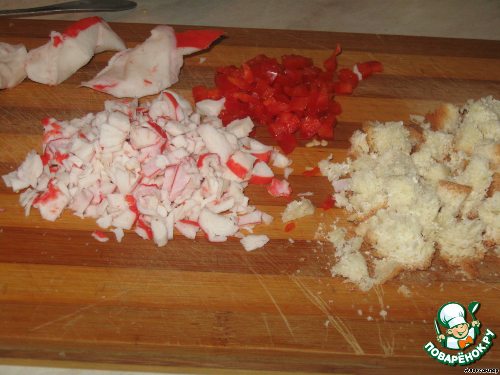 Мелко порезать крабовые палочки или мясо (вполне пройдет его заменитель, но если у вас есть настоящее это еще лучше), перец, булку.