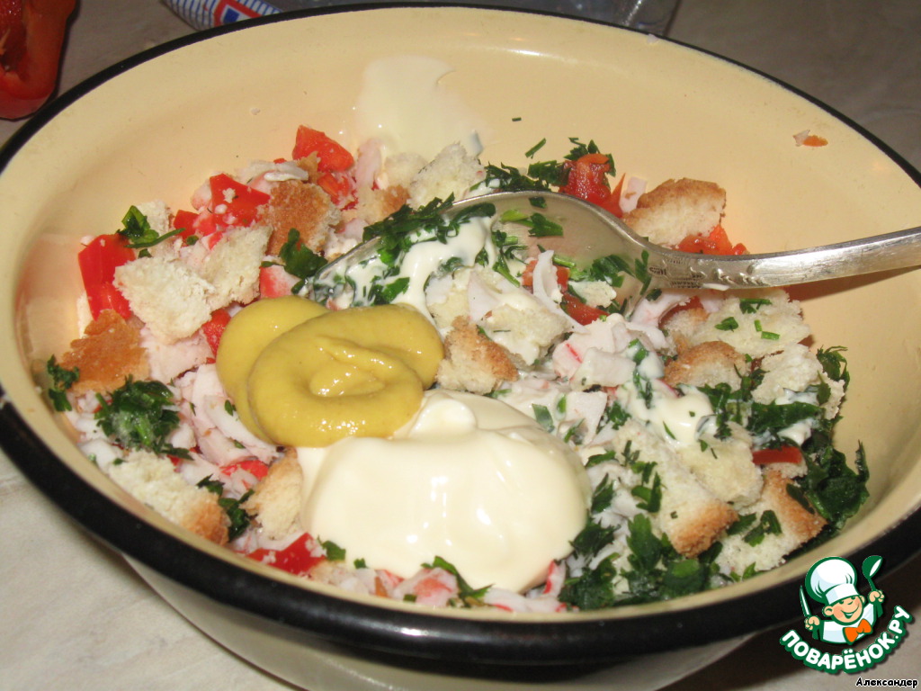 Смешать мясо крабовое, перец, булку, мелко порезанный зеленый лук (пару перышек), зелень, горчицу и майонез.