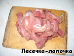 2. Мясо режем брусочками, солим, перчим по вкусу