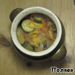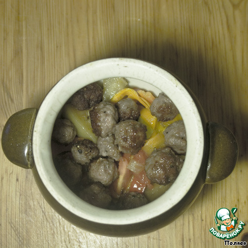 Достаем из духовки горшочек и складываем в него овощи и фрикадельки. -