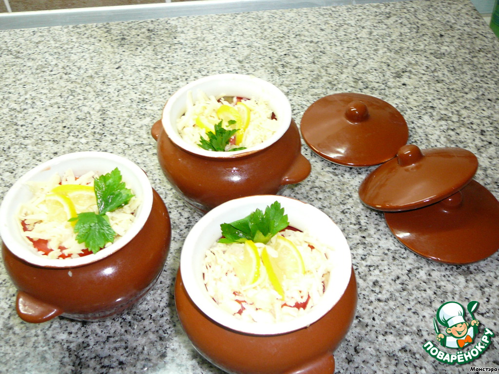 Содержимое горшочков выкладываем на большое блюдо, украшаем дольками лимона. Аромат....! Ну очень вкусно!!!