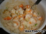 Яйца взбиваем, соединяем с массой, добавляем мелко нарезанные овощи, очищенные креветки, соль, перец, все перемешиваем.