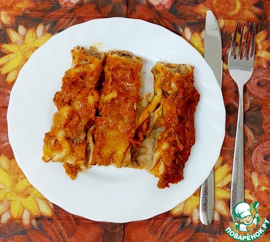 4. Выложите трубочки в глубокую сковороду (у меня получилось два ряда) и залейте соусом. Соус должен почти закрывать трубочки. Посыпьте тертым на крупной терке сыром (я резала кубиками).
