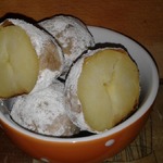 Все просто. Берем картофель, обязательно мокрый, и обваливаем в мучной смеси. Выкладываем на противень и ставим запекать в духовку при температуре 180-190 градусов примерно около часа, все зависит от размера картофеля.