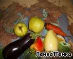 Баклажаны режем кубиками, перец соломкой, айву мелкими дольками, морковь кружочками. Посыпаем овощной приправой, черным перцем и немного солим.
