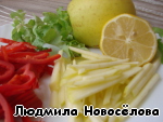 нарезали сладкий перец соломкой, яблоко сладкое нарезали соломкой и сбрызнули соком лимона.