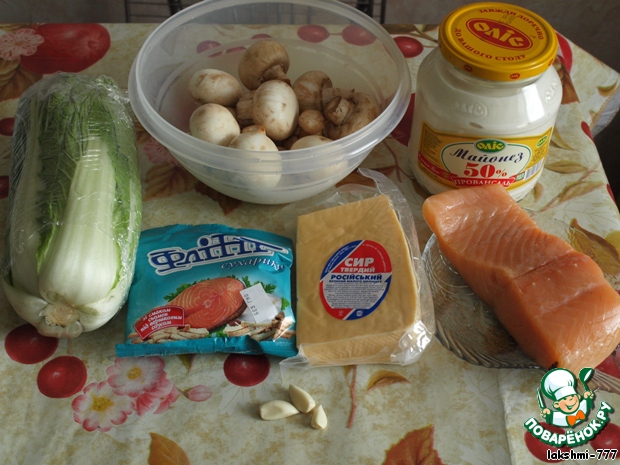 Салатов с таким названием на сайте много, но состав отличается. Предлагаю пикантный салатик для любителей красной рыбки в сочетании с пекинской капустой, шампиньонами и сухариками.