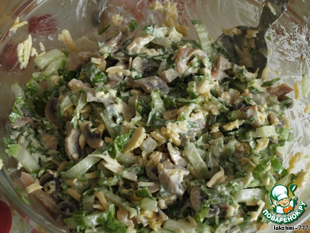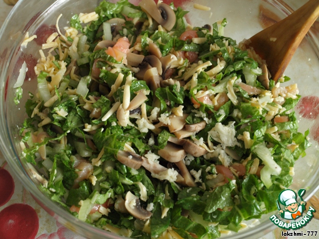 Грибы отварить 7 минут и нарезать тонкими пластинами (можно наоборот - нарезать пластинами и потушить в сковороде), капусту нашинковать, рыбу и сыр нарезать соломкой (сыр я натёрла на крупной тёрке). Всё смешать.