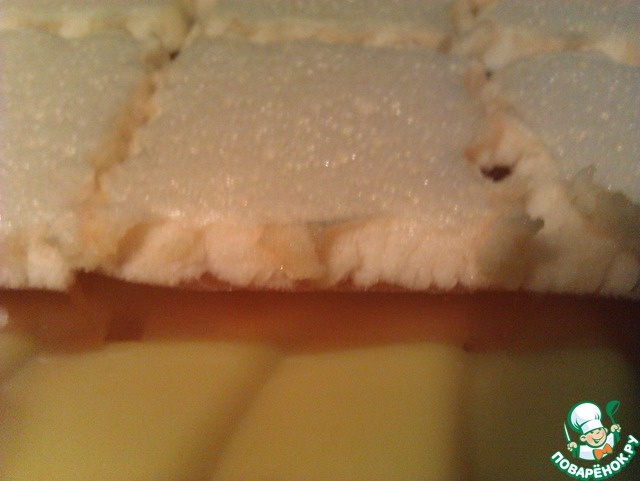 Достаём готовое суфле, посыпаем его сахарной пудрой, смешанной с ванилином, и переворачиваем на лист бумаги, также обсыпанный сахарной пудрой.