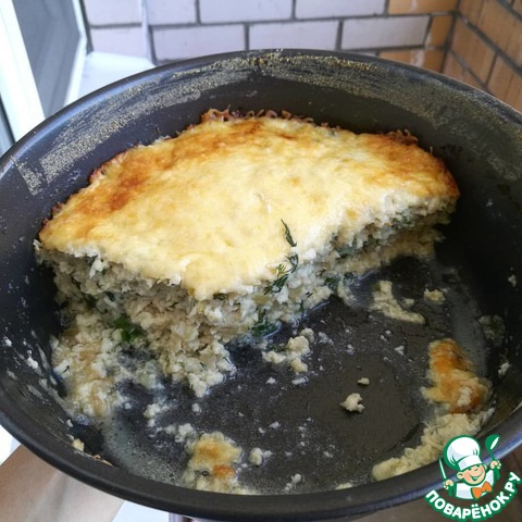 Выложить смесь в форму. Сыр потереть на мелкой терке. Посыпать сверху и в горячую духовку на 30 минут.