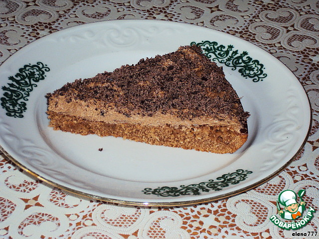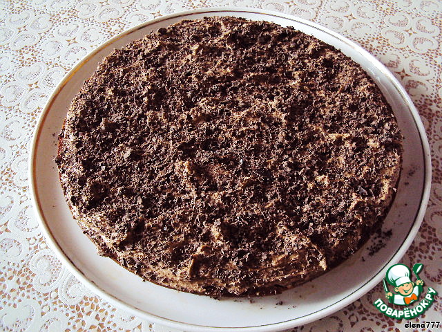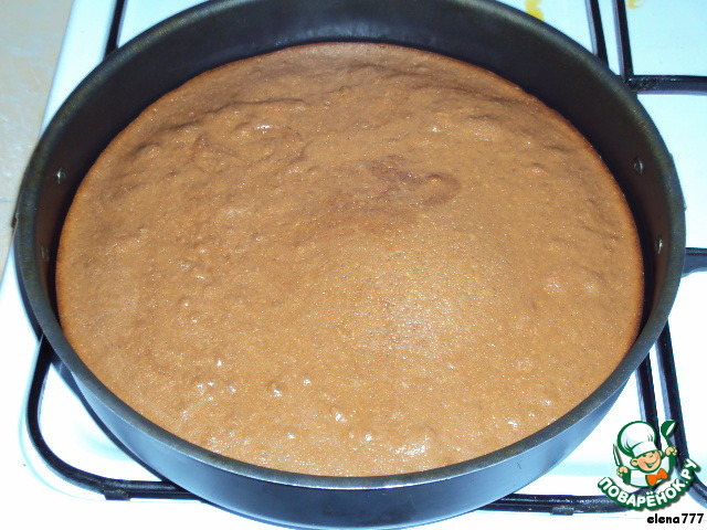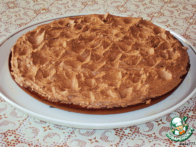 Корж остудить и выложить на блюдо. Промазать шоколадно-кофейным кремом, приготовив его по этому рецепту https://www.povarenok.ru/recipes/show/50015/