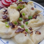 Сыр натереть на мелкой терке добавить майонез, перемешать и выложить на вареники. Украсить зеленью.