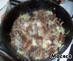 Лук мелко режем и обжариваем с грибами. Грибы у меня были предварительно отваренные. -