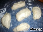 Достаем тесто, раскатываем его колбаской и делим его на несколько частей, у меня получилось 7. Каждую часть необходимо будет разделить еще на 2 - одна поменьше, вторая побольше.