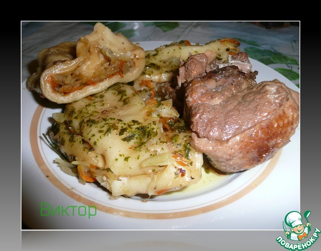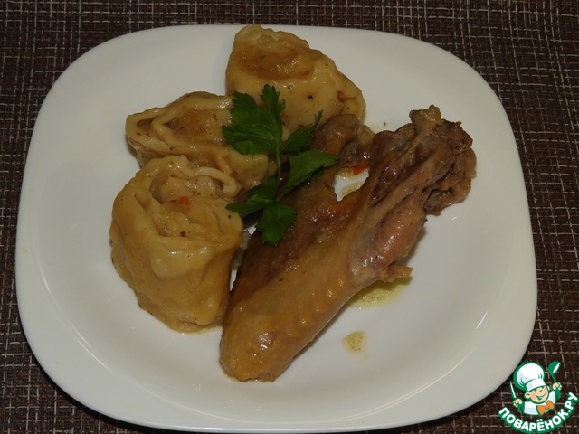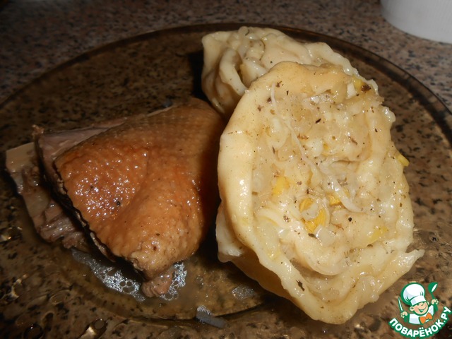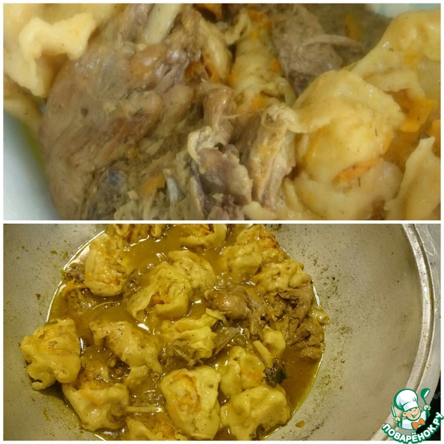 В первый раз попробовала это блюдо в гостях, совсем недавно (в эти "в гости" попала, практически, случайно). Очень вкусное, сытное блюдо, по вкусу чем-то напоминает и "бешбармак" и "манты", что-то среднее между этими вкусами. Готовит теперь это блюдо (почему-то) мой муж, так что на фотографиях его руки.