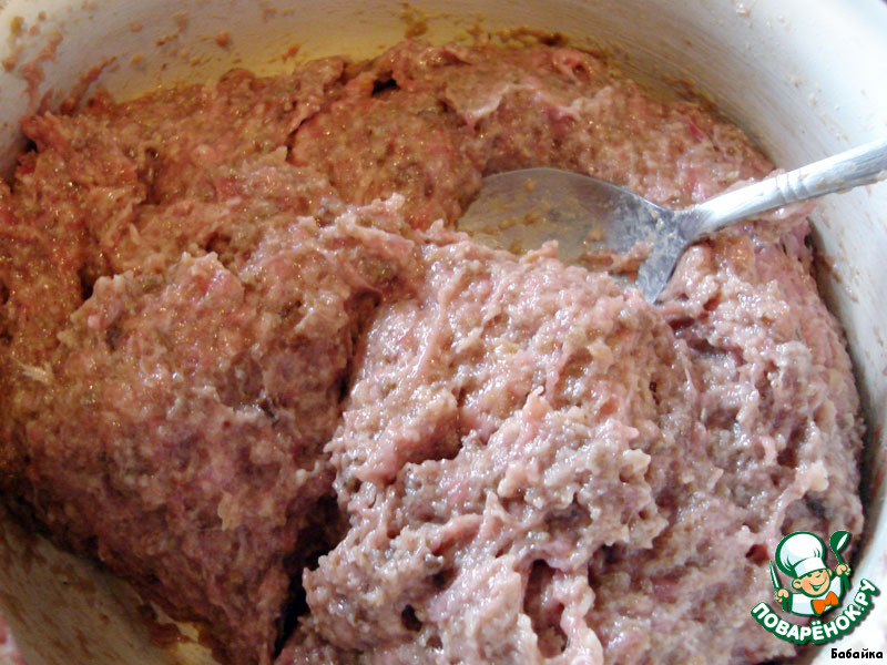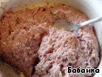 Добавляем к смеси фарш, соль, специи. Хорошенько вымешиваем.