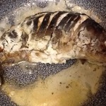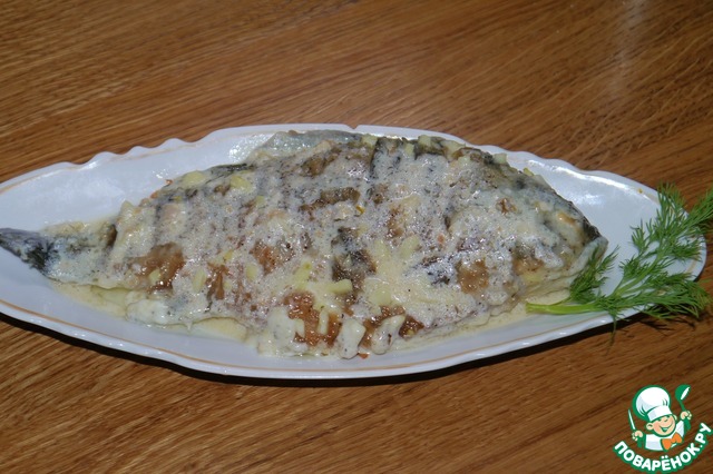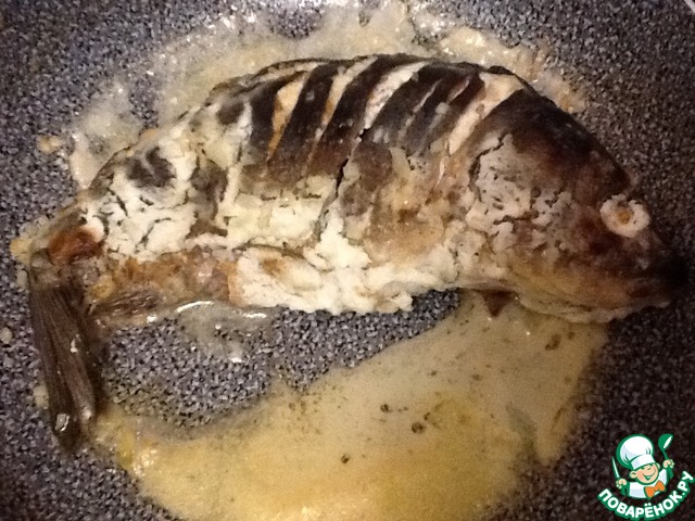 Карпы смазываем соусом и складываем друг на друга, чтобы пропитались сметанно-чесночным соусом. Тушим 5 минут.