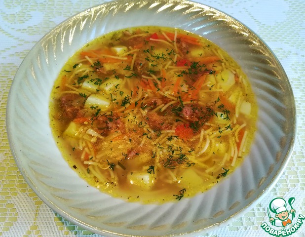 [+4]Тушенка из свинины, лапша- вермишель мелкая, специи не использовала, т.к. тушенка ароматная и вкусная сама по себе.