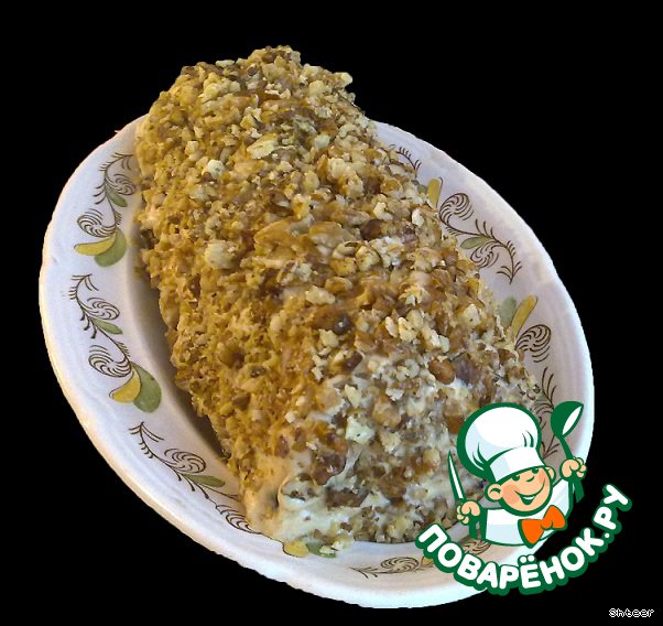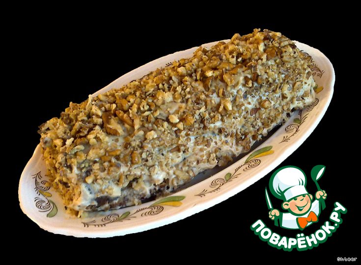 Мелко порезать ножом 100 грамм грецких орехов и обсыпать ими готовый рулет. Приятного аппетита!