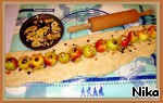 На раскатанное тесто уложить яблоки. Середину яблок наполнить изюмом и орехами. Кусочки бананов немного измельчить. Яблоки сверху посыпать корицей