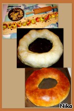 Скрутить начинённое тесто в рулет. Концы соединить. Смазать кольцо яичным желтком и дать подойти (минут 10). Затем поставить выпекаться в разогретую духовку на 45 минут при 180 градусах