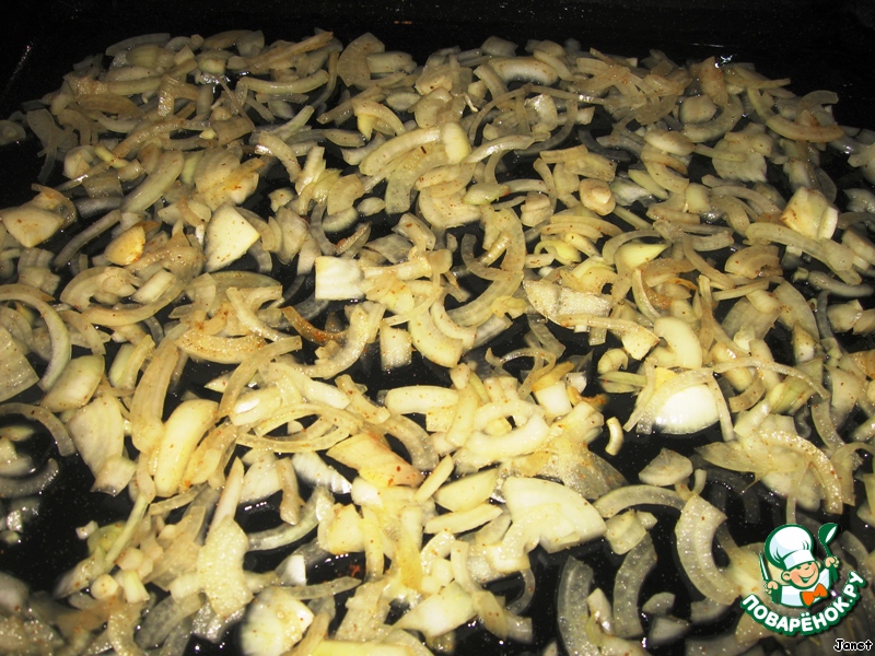 На смазанный маслом (подсолнечным рафинированным) противень выложить весь манинованный лук.