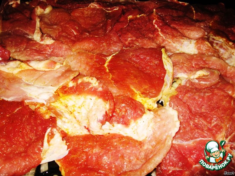 Мясо выложить в один слой на стол, посолить и посыпать приправами.