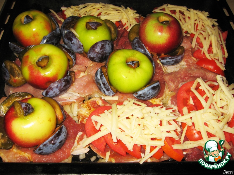 Многие люди не любят мясо со сладким гарниром, поэтому на одном противне у меня уживается и мясо с помидорами и сыром.