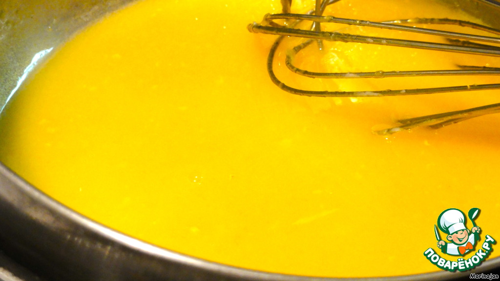 Желтки, сахар, сок / 0,5 стакана/ и цедру апельсина/ на очень мелкой терке / варить до