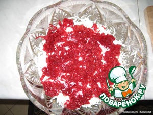 Морковь, свеклу, ядра грецкого ореха, желтки и белки ОТДЕЛЬНО натираем на терке.