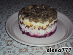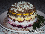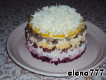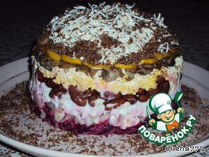 Последним слоем салата выложить свеклу с чесноком и майонезом. Каждый слой старайтесь ложкой прижимать к предыдущему, немного утрамбовывая.