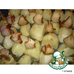 За это время мы режем сало (копчёное или солёное).Длина и ширина на ваш вкус, а толщина 4-5 мм (а то от сала ничего не останется). Теперь делаем паруса. Берём зубочистку и вставляем в сало с противоположных сторон. Паруса вставляем в картофель и запекаем при 200 градусах примерно 20 минут.