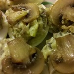 Яйца отварить вкрутую. Разрезать вдоль пополам и вынуть желток. Грибы с луком и желтками перемолоть в блендере, добавить сметану (или майонез), соль, щепотку молотого мускатного ореха (можно и без него). Получается очень вкусная паста, вполне применимая в других блюдах.