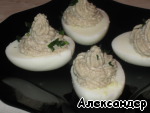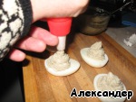 С помощью кондитерского шприца выдавить пасту в половинки яиц.