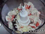 Лук и крабовое мясо измельчить в блендере или пропустить через мясорубку.
