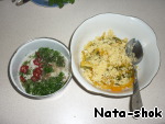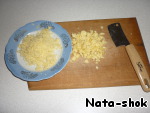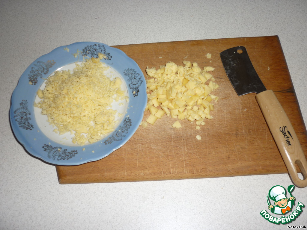 Тем временем нарезаем сыр мелким кубиком или натираем на мелкую терку.