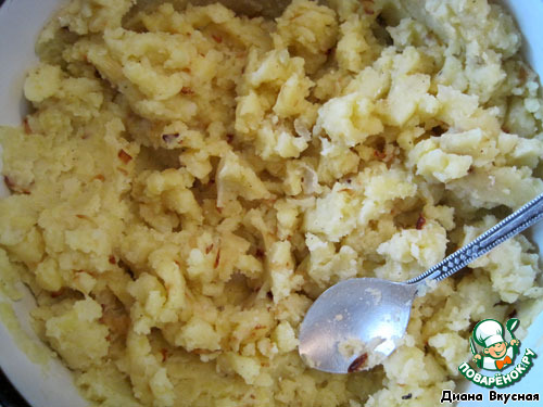 • Отварила картошку в мундире (пока горяча, очистила и раздавила), лук нарезала и обжарила на растительном масле и положила в картофель. Посолила, поперчила и хорошеничко замесила -это начинка.