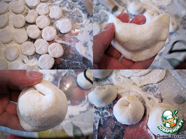• Замесила крутое тесто на воде, раскатала, вырезала кружочки толшиной, примерно, 1 см и диаметром, примерно, 5 см, раскатала пласты накрутила вареничков.