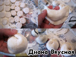 Замесила крутое тесто на воде, раскатала, вырезала кружочки толшиной, примерно, 1 см и диаметром, примерно, 5 см, раскатала пласты накрутила вареничков.