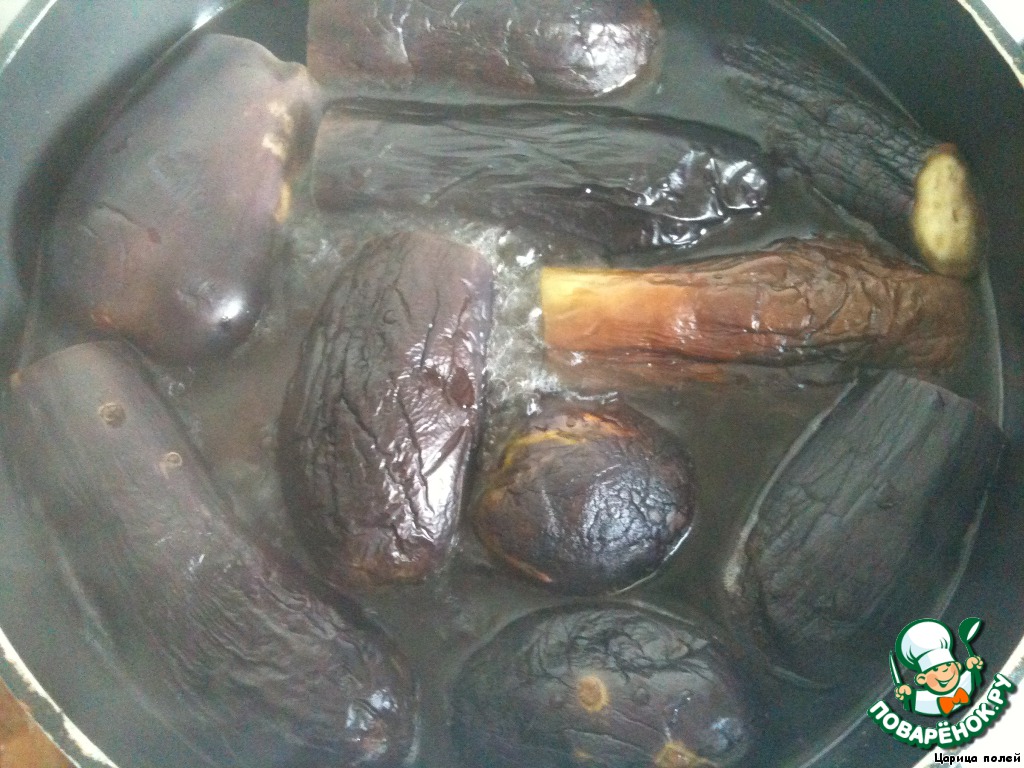 Баклажаны помыть, запустить в кипящую воду и отварить в течение 7 минут. Затем слить воду и дать немного остыть. А пока можно приготовить начинку.