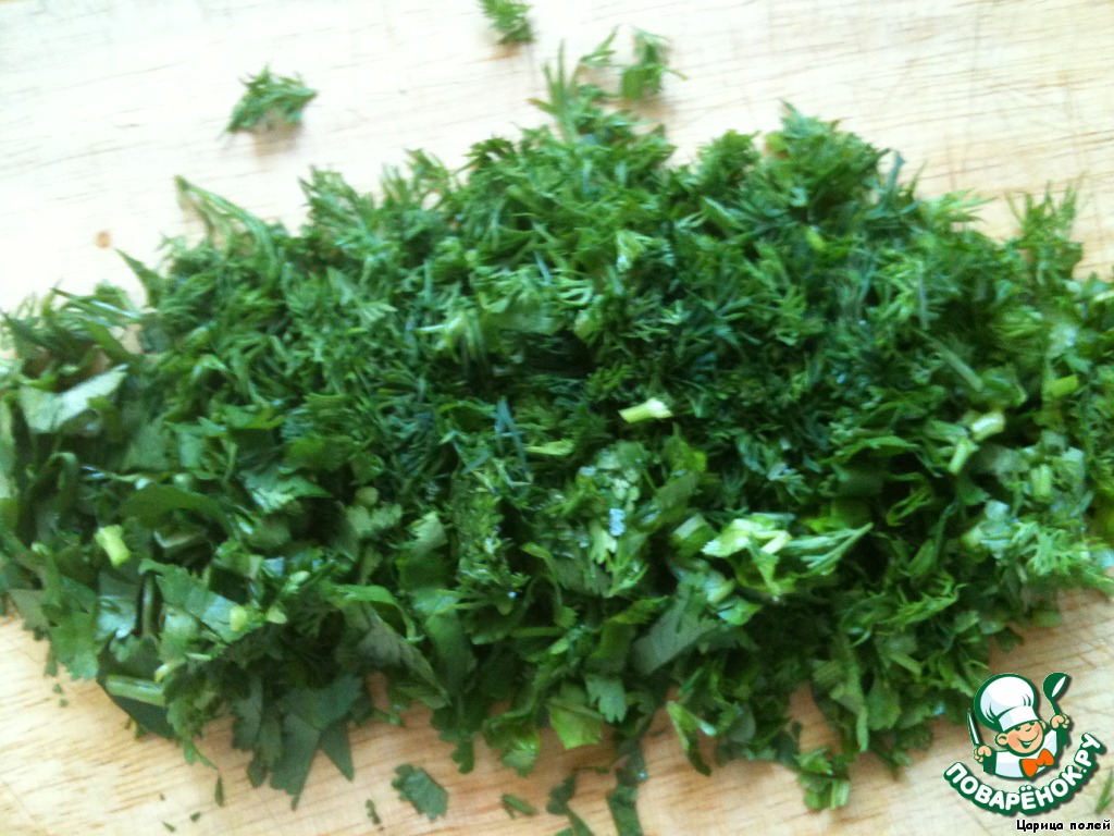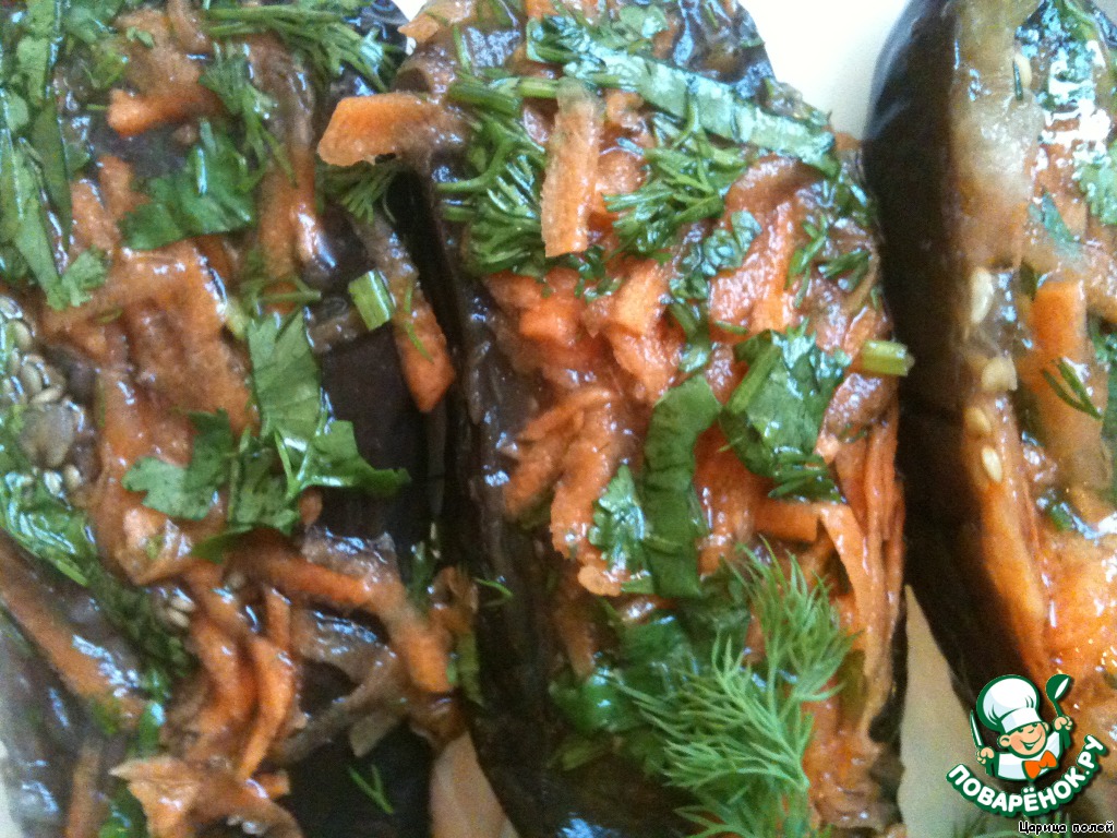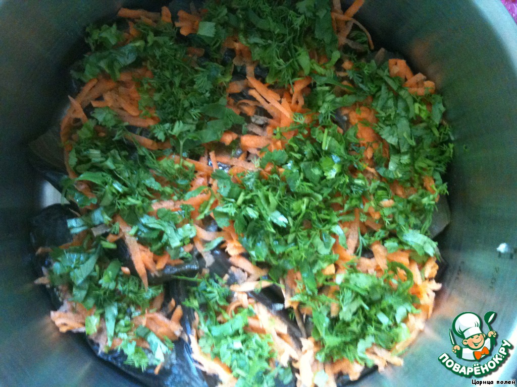 И в завершение, на каждую половинку уложить рубленую зелень. Далее - снова слой баклажанов, чеснок, морковь и зелень - до тех пор. пока не закончатся ингредиенты.
