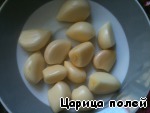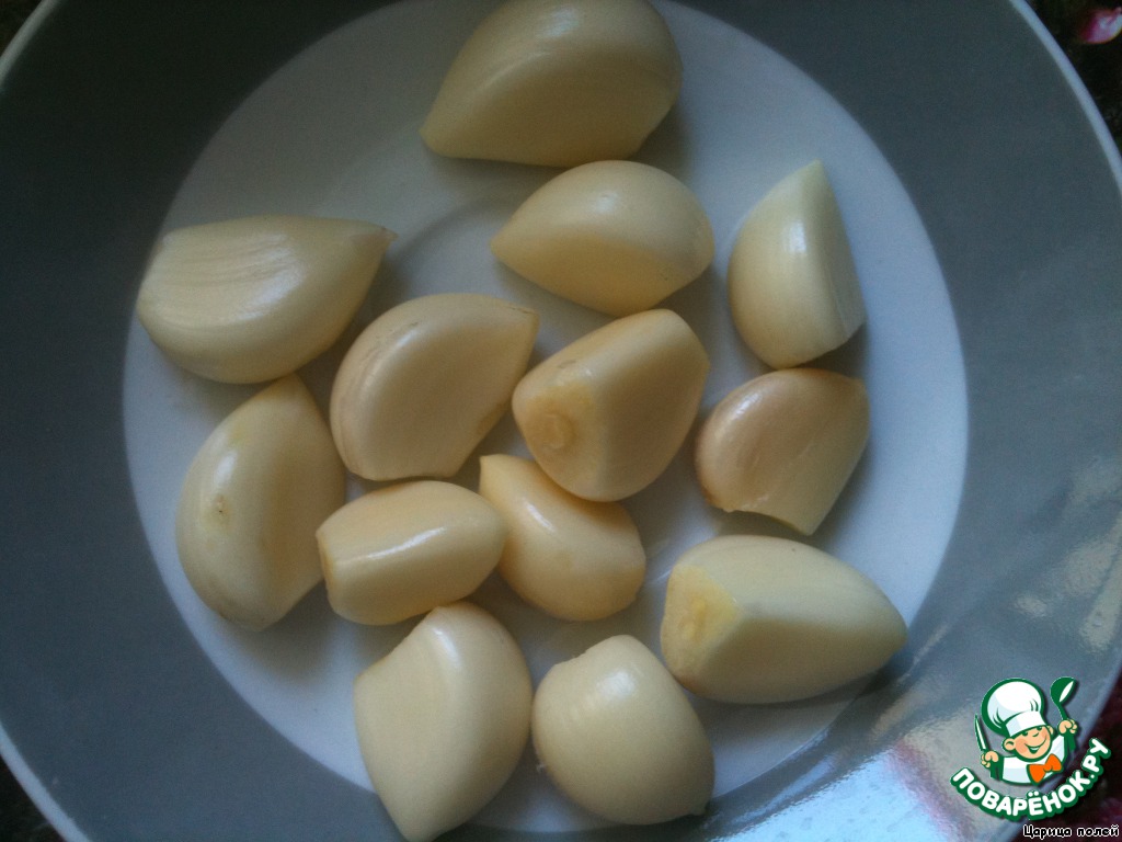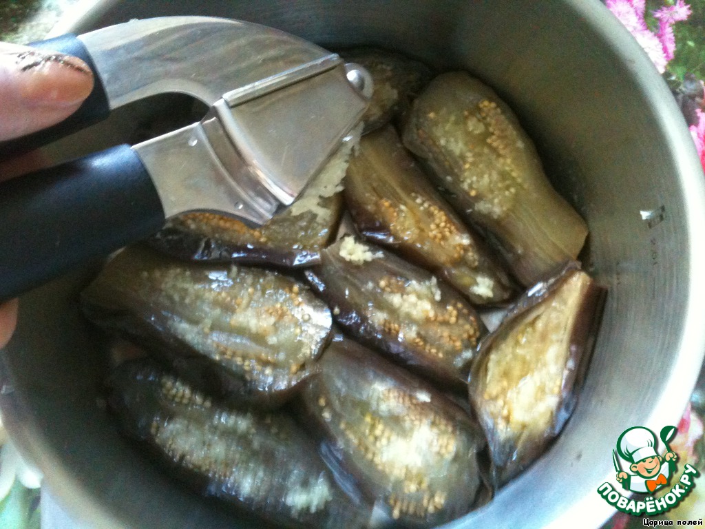 Теперь на каждую половинку выдавить через пресс чеснок. Примерно ползубчика на половинку баклажана. Немного вдавить его внутрь баклажана.