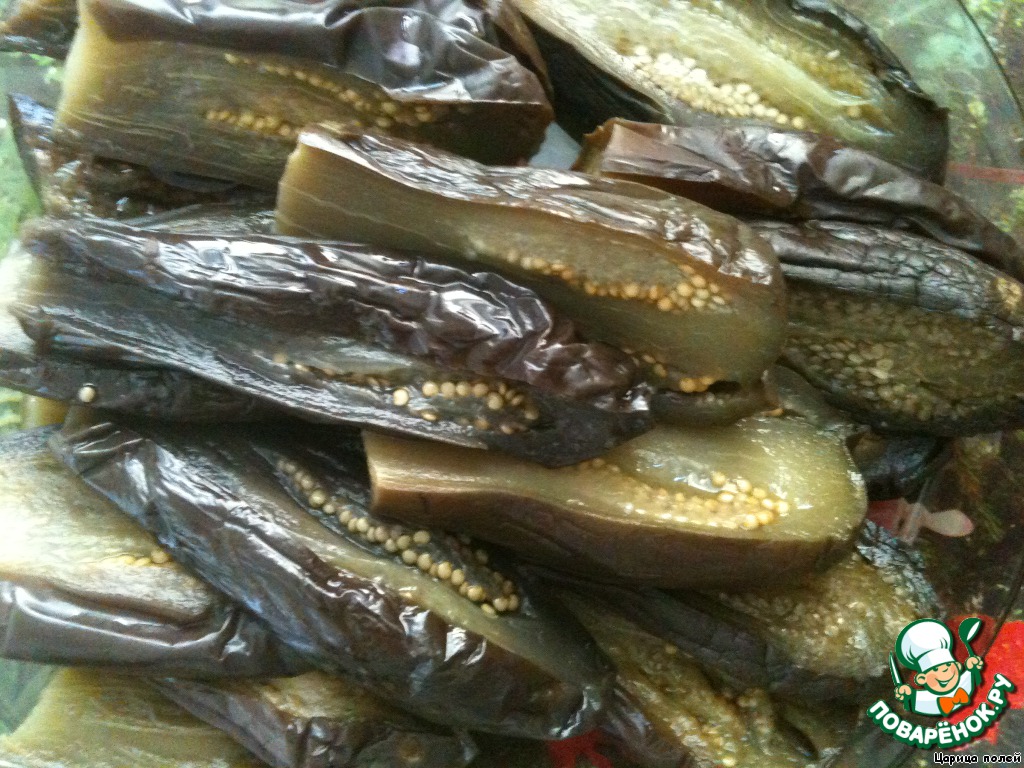 Порезать баклажаны вдоль. Они должны быть ещё тёплыми.