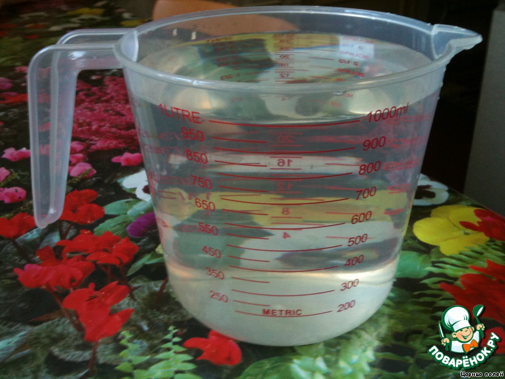 Теперь приготовим маринад: в 1 литре кипячёной и тёплой воды (около 70 градусов) растворить соль и сахар, затем добавить уксусную эссенцию.